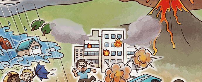 - 毒ガスを吸い込まないように、口と鼻を濡れたタオルなどで覆い、その場からすぐに離れる。