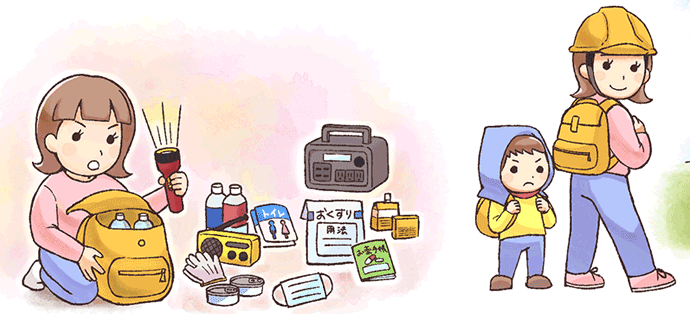 避難時に「すぐ持ち出せる」よう、リュックサックにまとめ、玄関や寝室の近くに置きます。